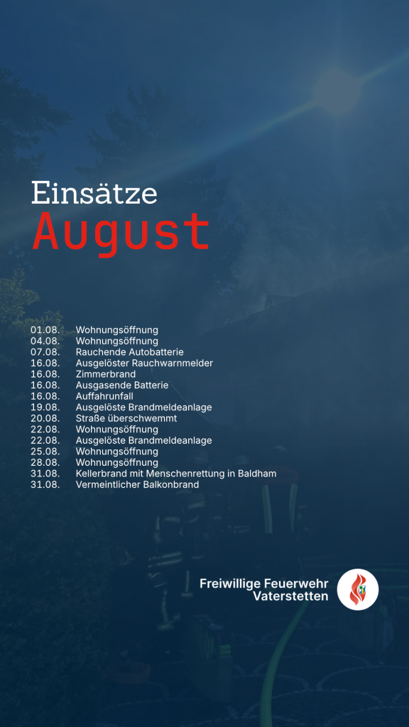 Im August wurden wir zu insgesamt 15 Einsätzen alarmiert, darunter sieben Brand- und acht Hilfeleistungseinsätze. 🔥 Brandeinsätze 3x Brandmeldeanlage 1x Mittelbrand 1x Kleinbrand 1x Brand bei Eintreffen bereits gelöscht 1x Blinder Alarm 🛠️ Technische Hilfeleistungen 5x Raum-/Wohnungsöffnung bei akuter Gefahr 1x Unfall mit Straßenfahrzeugen 1x Unwetterschäden 1x Sonstige Hilfeleistungen Bis…
