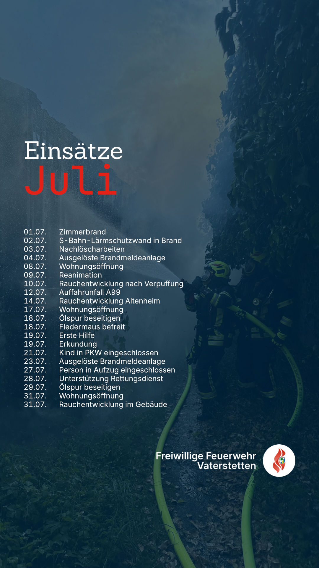Mit 21 Einsätzen war der Juli, bezogen auf die Gesamtzahl der Alarmierungen, ein durchschnittlicher Monat für die Feuerwehr Vaterstetten. Erfreulich für unsere Ehrenamtlichen: Zwischen 22 und 6 Uhr wurden wir im Juli kein einziges Mal alarmiert 😴