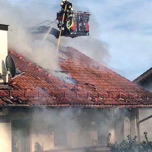 Die parallel eingeleitete Bekämpfung des Dachstuhlbrandes, wurde über zwei Drehleitern durchgeführt. Da der Dachstuhl auf der gesamten Breite Feuer gefangen hatte, zogen sich die Löscharbeiten bis in den späten Abend hinein.