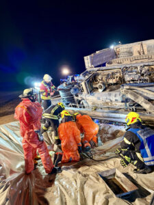 Am gestrigen Dienstagabend um 18:44 Uhr wurde die Feuerwehr Vaterstetten von der Feuerwehr Pöring zur technischen Hilfe bei einer umgekippten Baumaschine nachgefordert. Auf dem Ingelsberger Weg zwischen Ingelsberg und Baldham war auf Zornedinger Flur ein LKW-Gespann verunfallt – dabei war der mit einer schweren Baumaschine beladene Tiefladeranhänger in das angrenzende Feld gekippt.