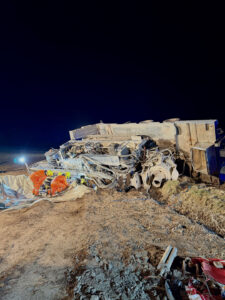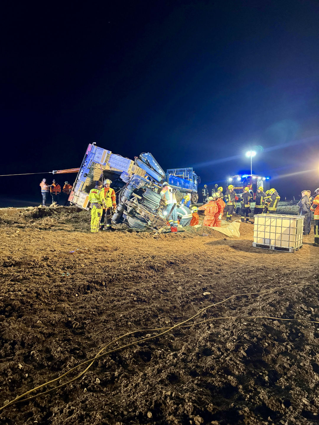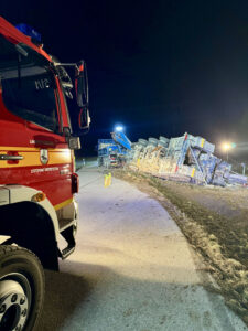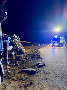 Wir unterstützten die ortszuständige Feuerwehr Pöring bei der Sicherung des umgekippten Gespanns mit der Seilwinde, beim Eindämmen und Abpumpen des ausgelaufenen Hydrauliköls sowie bei der Verkehrsabsicherung. Nachdem durch die Feuerwehren eine stabile Lage hergestellt worden war, wurde die Einsatzstelle an die Polizei und ein Bergungsunternehmen übergeben, das mit einem Kran die weitere Bergung des Gespanns übernahm.