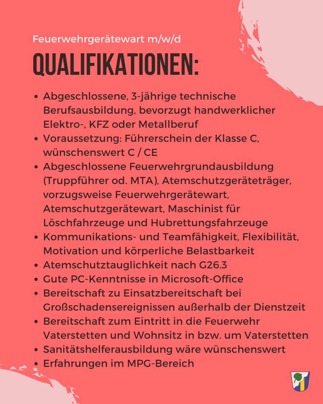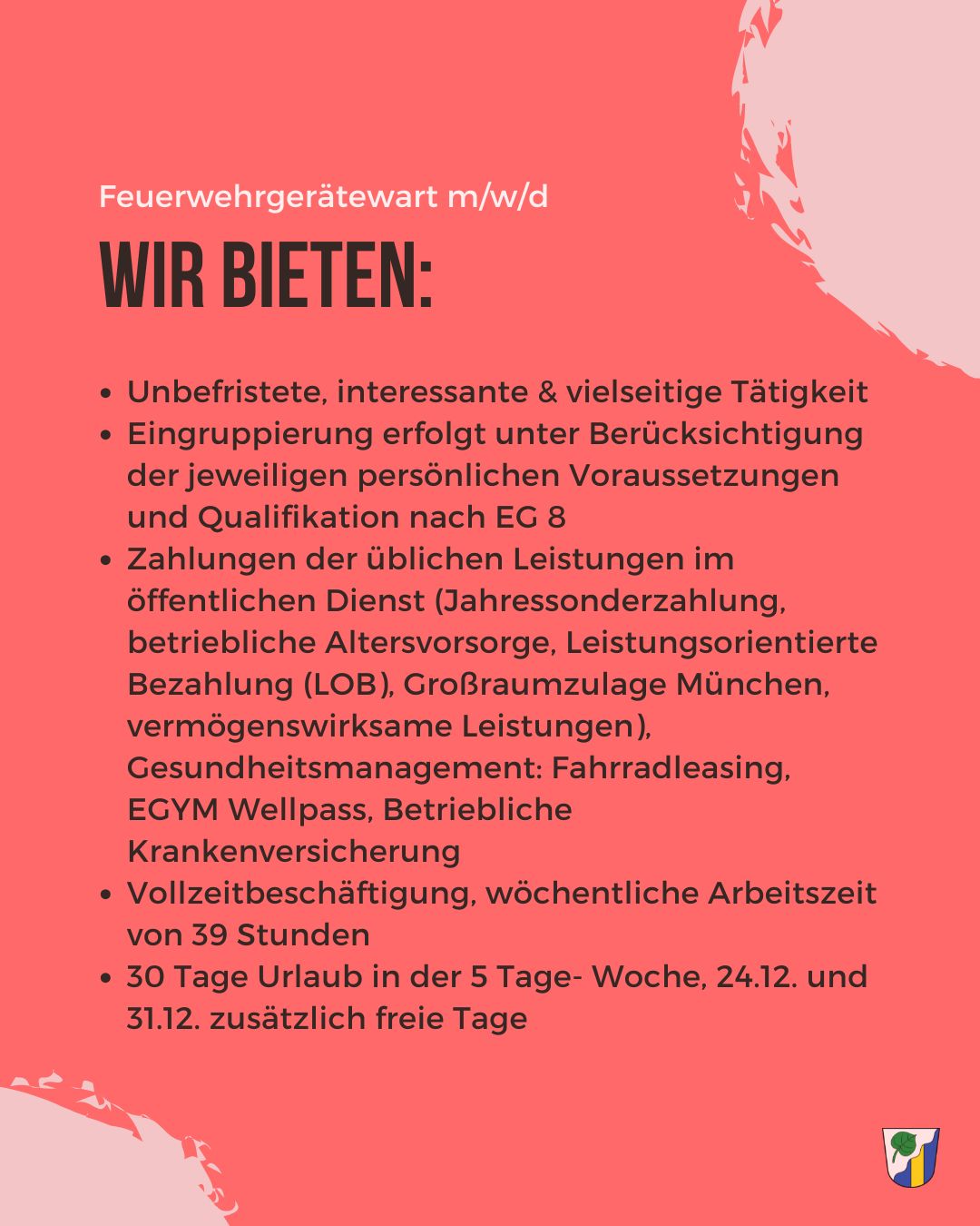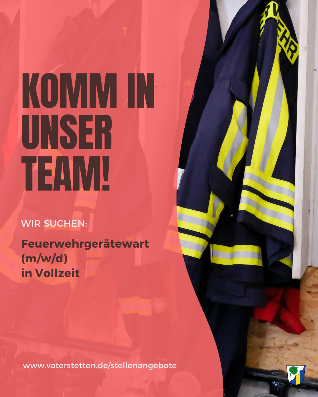 Die Gemeinde Vaterstetten sucht zum nächstmöglichen Zeitpunkt einen Feuerwehrgerätewart (m/w/d) in Vollzeit.